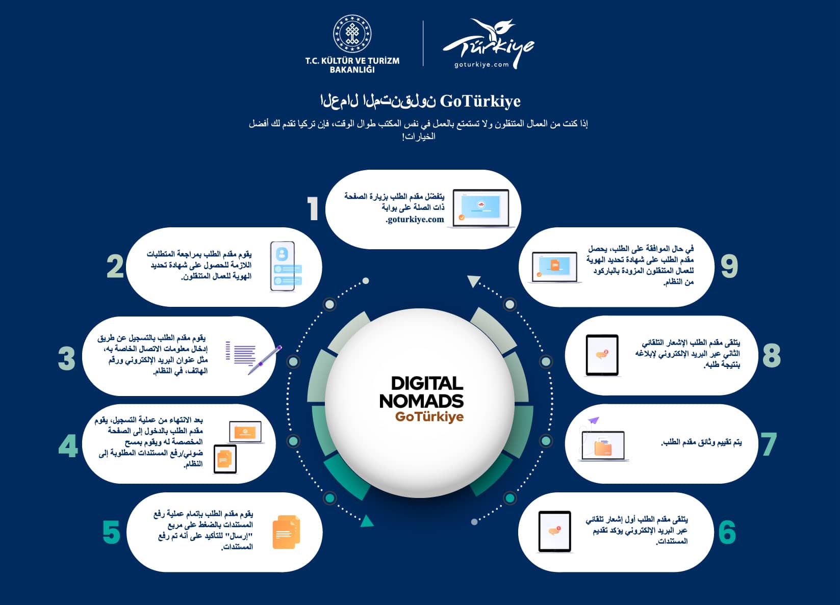 يمكن للعمال المتنقلون التقدم بسهولة للحصول على تأشيرة العمال المتنقلون عن طريق الذهاب إلى مركز/قنصلية التأشيرات التركية باستخدام شهادة تحديد الهوية للعمال المتنقلون التي تم الحصول عليها من خلال هذه المنصة. يمكنك الحصول على شهادة تحديد الهوية للعمال المتنقلون عن طريق تحميل المستندات على المنصة التي تثبت أنك عامل متنقل يتراوح عمرك بين 21 و55 عامًا. ستقوم هذه المنصة بمراجعة المستندات المقدمة لتحديد أهلية مقدم الطلب باعتباره عامل متنقل. إذا كانت المستندات كافية، سيتم تخصيص شهادة تحديد هوية العمال المتنقلون لمقدم الطلب. ثم يمكنك التقدم بطلب للحصول على تأشيرة العمال المتنقلون في مركز/قنصلية التأشيرات التركية باستخدام شهادة تحديد هوية العمال المتنقلون المعينة وغيرها من المستندات المطلوبة.